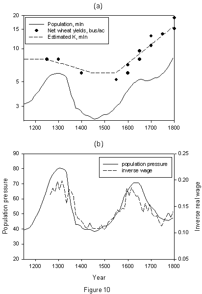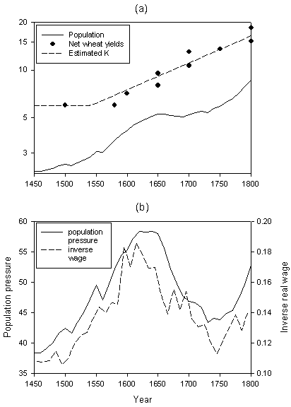 England (Turchin 2005, see also Appendix at the end of this chapter). (a) Population numbers (in million), net yields (in bushels