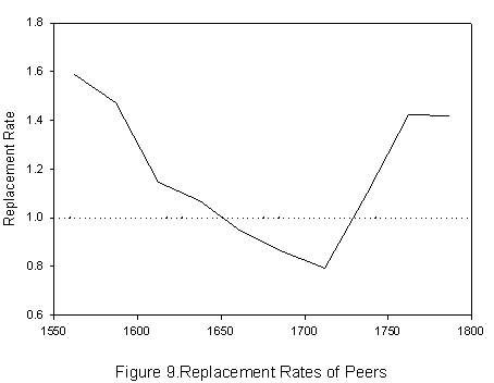 1540–1800 were taken from Table A.9.1 in Wriglely et al. (Wrigley et al. 1997). The quinquennial data of Wrigley et al. were resampled at