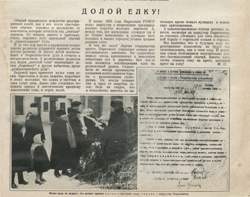 Газета «Безбожник» (1929, № 51), выступая за «разоблачение контрреволюционной роли рождественской сказки», рекомендовала провести 6 января вечером факельный антирождественский карнавал и во время процессии «сжечь макеты елок».