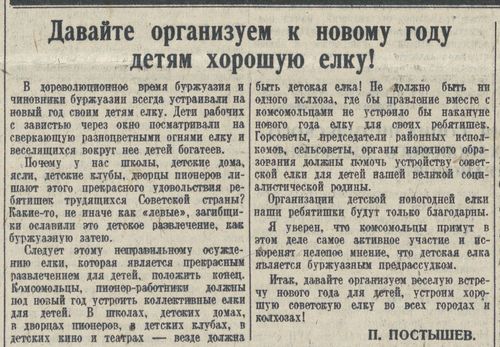 В том же году 28 декабря в газете «Правда» была опубликована заметка второго секретаря ЦК КП(б) Украины Петра Павловича Постышева «Давайте организуем к новому году детям хорошую елку!». Его инициатива была признана своевременной, и буквально за считанные дни праздник был возвращен в круг признанных на государственном уровне торжеств, ёлка вышла «из подполья» как символ счастливого советского детства. На смену Рождеству пришел Новый год.