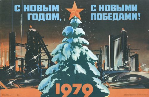 Значимым элементом предновогоднего оформления были плакаты. Сюжеты плакатов, с одной стороны, традиционны: Дед Мороз, украшенные ёлки, снежинки, мальчик или девочка, которые олицетворяют Новый год, виды заснеженных городов и Московского Кремля с циферблатом часов на Спасской башне. С другой стороны, на новогодних плакатах зафиксированы приметы эпохи: особенно интересно рассматривать сегодня те, на которых изображены строящиеся города, дома и заводы.