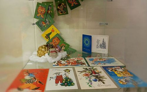 Среди экспонатов выставки можно также увидеть новогодние атрибуты советского времени: елочные украшения из стекла и картона, бумажные флажки-гирлянды, поздравительные открытки известных художников Владимира Зарубина, Владимира Четверикова, Ивана Дергилева, Константина Андрианова, Лидии Маниловой, которые до сих пор хранят во многих семьях как трогательное воспоминание о детстве и советской эпохе.