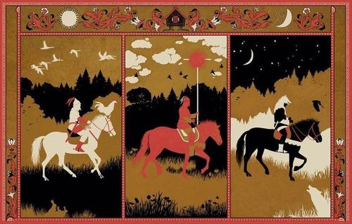 Художник Наталья Акимова Иллюстрация к сказке «Василиса прекрасная»: «Белый всадник на белом коне — День ясный, Красный всадник на красном коне — Солнышко Красное, Черный всадник на черном коне — Ночь Темная»