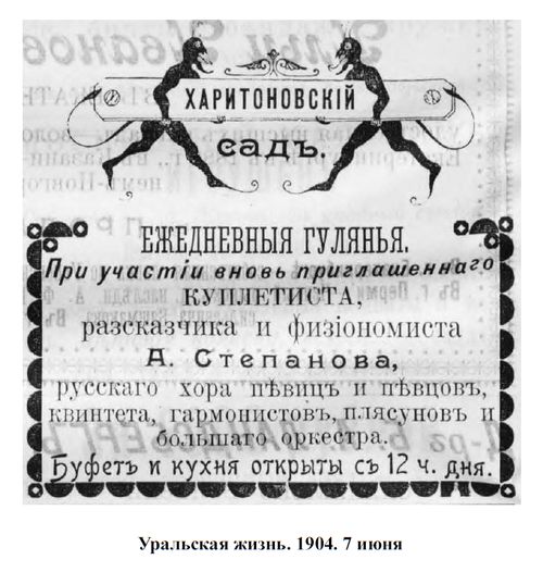 В дореволюционном Екатеринбурге большинство садов были частными — их обустраивали при усадьбах знатных купцов: Казанцевых, Рязановых, Харитоновых-Расторгуевых. Однако к концу XIX века парки все чаще становились общественными. Особой любовью горожан пользовался Харитоновский сад. Ежегодно его сдавали в аренду, и каждый новый хозяин старался удивить публику. Чаще всего арендатором становился В. В. Семенов. При нем здесь регулярно давали театральные представления и приглашали звезд того времени: певицу Наталью Пушкину, куплетиста Волховского, мужскую капеллу Ф. П. Павлова и ансамбль В. М. Моисеева.
