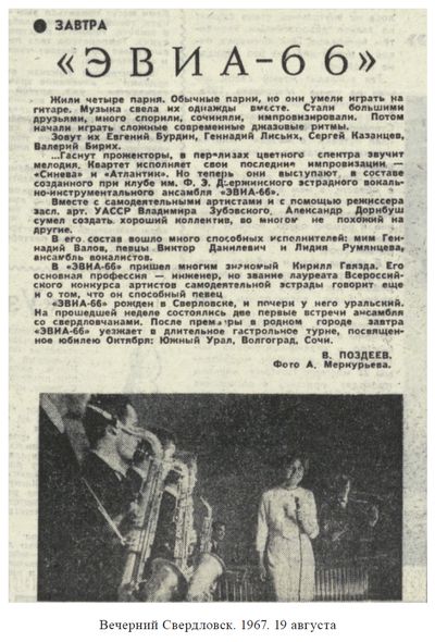 В 1960-е рок-н-ролл в Свердловске «гулял» в основном по дворам. Любительская группа ЭВИА-66, первая в городе, выступала в ДК строителей им. Горького и даже давала платные концерты. Продавал билеты на свои концерты и ансамбль «Ровесник» (в газетах упоминался как «Мелодия») дворового клуба в районе школы № 40 на ул. Мичурина. Именно «ровесники» одними из первых начали писать музыку на собственные стихи и репетировать в ДК им. Свердлова, где позже откроется легендарный рок-клуб. А в 1971 году на смотре в ДК им. Дзержинского музыканты получили выговор от газеты «На смену!» за дерзкий внешний вид. Там же был создан клуб гитаристов.