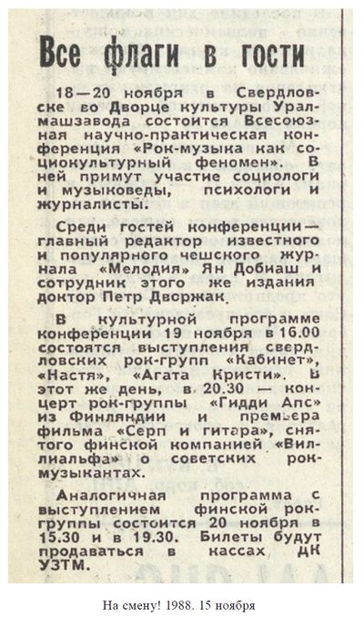 1986 год стал переломным: в Свердловске официально открылся рок-клуб. Власти выделили помещение в ДК им. Свердлова на Володарского, 9. Маленькая комната в этом здании вплоть до 1990-х служила штабом. Здесь же в 1986 году прошел первый фестиваль, именовавшийся тогда «творческой мастерской» (позже фестивали и смотры с отбором групп стали разделять). В августе того же года состоялась вторая «творческая лаборатория» рок-клуба. А еще раньше, 13 июня, во время Праздника советско-чехословацкой дружбы, городское руководство решилось показать иностранным гостям «новое искусство»: в Историческом сквере выступили группы «Урфин Джюс», «Наутилус», «Флаг» и «Трек». Тогда же в газете «На смену!» опубликовали первую фотографию свердловских рокеров.