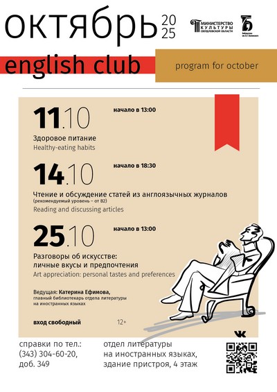 Отдел литературы на иностранных языках приглашает в октябре на встречи Английского разговорного клуба. Новые встречи состоятся 11, 14 и 25 октября.