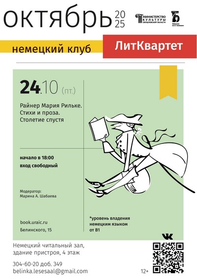 Октябрьская встреча ЛитКвартета в Немецком зале будет посвящена творчеству Райнера Мария Рильке, 150-летие которого отмечается в 2025 году. В Немецком читальном зале Белинки вы найдете не только томики стихов Рильке, но и книги прозы, издания его переписки с Мариной Цветаевой и Лу Андреас-Саломе.
