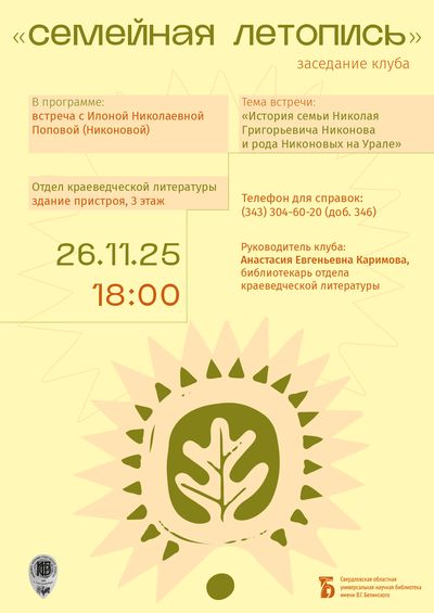 26 ноября в 18:00 клуб «Семейная летопись» приглашает на встречу с И. Н. Никоновой, дочерью уральского писателя Николая Григорьевича Никонова.