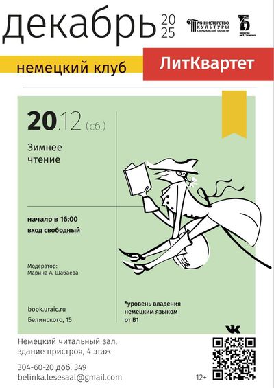 20 декабряв 16:00, знаменуя начало таинственного времени – зимних дней между католическим и православным Рождеством. В продолжение ноябрьской встречи с любимыми книгами в Немецком зале читатели выбирают для зимнего чтения одну или несколько книг, прочитанных когда-то давно или специально для Литературного вечера, чтобы рассказать о своих впечатлениях и послушать истории других книг зимнего чтения. Литературный вечер традиционно пройдет на немецком языке.