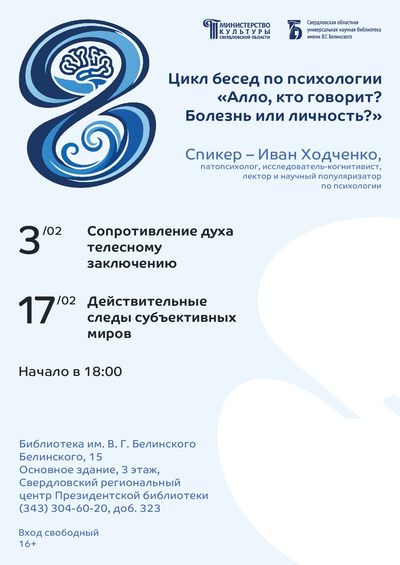 3 февраля (вторник) в Свердловском региональном центре Президентской библиотеки продолжается цикл встреч по психологии «Алло, кто говорит? Болезнь или личность?». Тема беседы «Сопротивление духа телесному заключению».