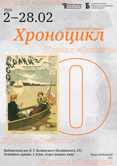 В феврале 2026 года в отделе редких книг на выставке проекта «Хроноцикл» представлен журнал «Осколки».«Осколки» — русский юмористический литературно-художественный еженедельный журнал. Издавался в Петербурге с 1881 по 1916 год.В отделе редких книг хранятся экземпляры журналов «Осколки» с 1895 по 1904 годы.ПодробнееКуратор — Ессяк Л. М.Вход свободныйВозрастная категория: 12+Справки по телефону: (343) 3046020, доб. 329 (отдел редких книг)