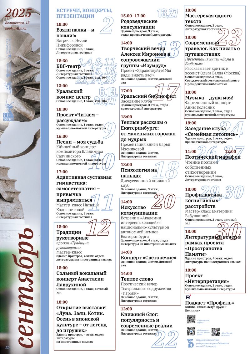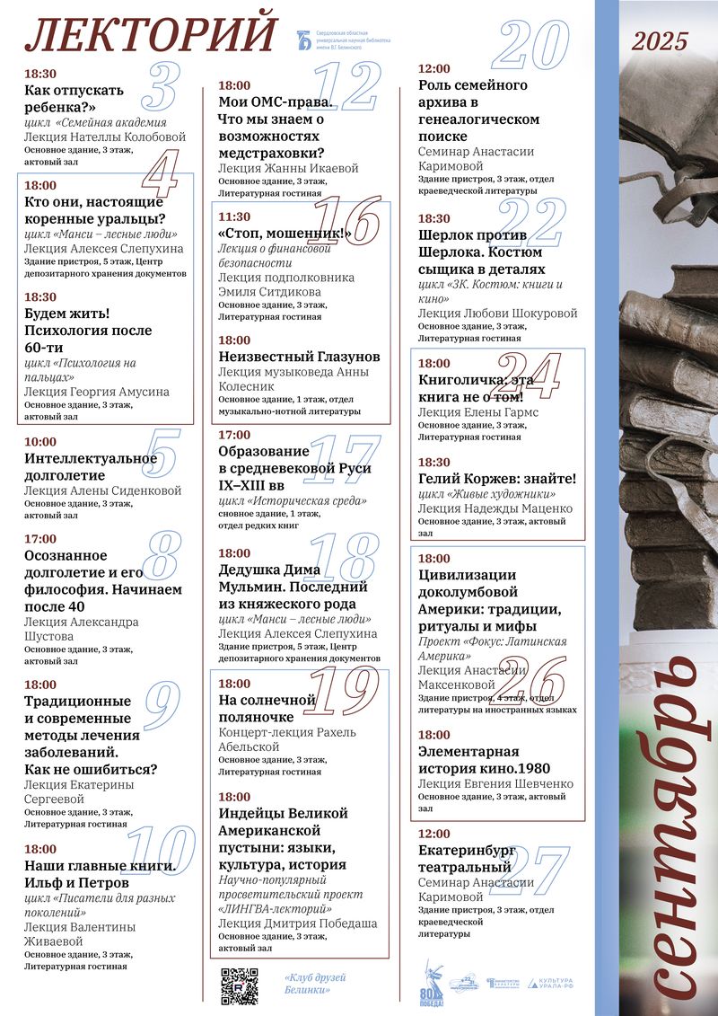 Дорогие читатели, предлагаем вместе с нами открыть новый сезон! Подготовили для вас афишу, наполненную интересными встречами, литературными вечерами, художественными и книжными выставками. В этом месяце с Анастасией Каримовой проследим изменение театрального репертуара в дореволюционном Екатеринбурге. Поговорим о ключевых темах в творчестве Гелия Коржева на арт-лекции Надежды Маценко. Вместе с филологом Валентиной Живаевой обсудим, почему велик читательский успех произведений Ильи Ильфа и Евгения Петрова. Получим советы семейного психолога Нателлы Колобовой, как правильно поддерживать самостоятельность детей. Знаковым событием сентября станет встреча в библиотеке с известным критиком и эссеистом Ольгой Балла (Москва) на тему «Современный травелог. Как писать о путешествиях». Ольга расскажет, как создавать яркие и эмоциональные тексты о путешествиях, разберет с гостями особенности жанра, подходы к написанию путевых заметок, способы передачи атмосферы места. Помимо прочего, особое внимание в этом месяце будет уделено людям «серебряного возраста». Специально для них ко Дню пенсионера в Свердловской области и Международному дню пожилого человека подготовлена событийная программа «Время для жизни», поднимающая следующие темы: здоровье и долголетие, история семьи и генеалогическое древо, информационная безопасность, творчество классиков русской литературы и произведения современников. Также в сентябре мы представим читателям книжные выставки «Памятные даты сентября», «Архитектура знаний» (ко Дню знаний), «Ключи мира: искусство перевода» (ко Дню переводчика), «Этой краткой жизни вечным измененьем» (к 155-летию со дня рождения Ивана Бунина) и другие. Приглашаем провести сентябрьские дни в уютной атмосфере книжных полок и интересных мероприятий!