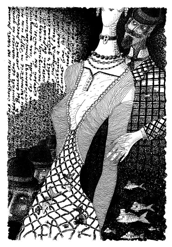 В первом листе центр композиции — стройная женская фигура, затянутая в платье-сеть, с арсеналом всех дамских ухищрений (бусы, серьги, кружева, бархотки), слева от которой — когорта мужских голов в котелках с косящим алчным взглядом, справа — господин с похотливыми глазами, в клетчатом костюме, напоминающем тюремные решётки. Перемалывающую силу феминного притяжения дополняют нахальные рыбки в котелках и их незадачливые, уже уловленные коллеги.