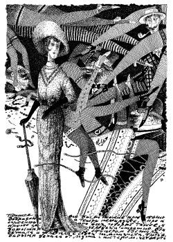 На такой женской черте, как разговорчивость и тяга к сплетням, акцентировано внимание в четвертом листе. Сетчато-ячеистая структура вуали, шляпы, воротника, волос ассоциируется с уловлением в западню, из которой невозможно вырваться; сопрягаясь с цитатой, она образует полифоническую ткань визуального повествования, где притягательные детали дамских нарядов звучат как раскрытие отдельных аспектов общей темы.