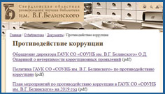 Виртуальная выставка, посвященная противодействию коррупции: книги из фонда Свердловской областной универсальной научной библиотеки им. В. Г. Белинского, диссертации, статьи из журналов, информационно-нормативные ресурсы.